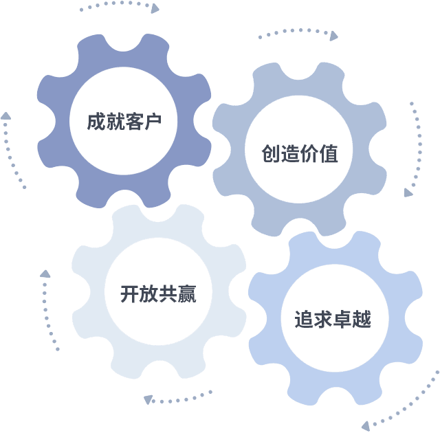 成就客户是一切决策的出发点,,,创造价值是衡量所有工作的标准,,,追求卓越是我们做事做人的态度,,,开放共赢是我们的格局也是最终的结果。。。。价值观的齿轮环环相扣,,,推动着组织里的每个人不断向前。。。