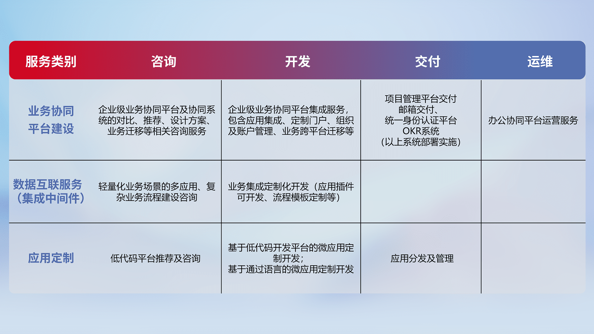 针对钉钉、、企微、、、、IDaas等平台级产品提供产品的规划、、、、方案、、、交付、、、定制化开发等服务,,实现如统一协同办公、、智能客户服务、、混合会议管理、、、、智能数据查询、、等业务场景,,,实现数字化转型。。。