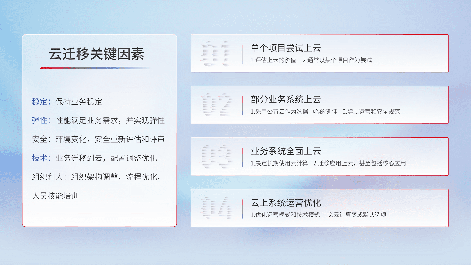 结合实际业务,,,,从规划设计、、、云平台选型、、、云原生改造、、数据迁移、、、集成交付,,,,迁移全过程为客户识别最佳上云路径,,做好风险识别管理,,设计网络架构、、、身份权限、、、、安全审计合规、、操作审计、、、日志审计、、、监控告警策略、、多站点容灾设计等,,,对云上基础设施进行整体规划,,提升IT治理水平,,以满足弹性、、、高可用、、、、高性能的需求。。。