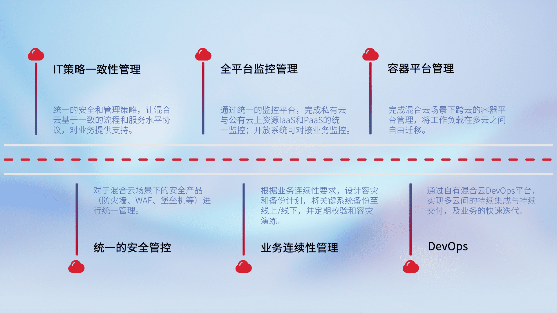 通过多云纳管,,,以统一的资源数据模型把客户的云资源进行抽象和封装,,,,进而实现对多云资源的统一操作,,,保障云资源管理的可靠性、、稳定性与可用性。。。。量身定制化运维内容,,,,配置、、开发运维、、、补丁管理、、、备份、、、监控、、、、认证和访问管理、、、审计和日常巡检等,,,,保障在用云过程中的可靠度,,稳定度以及高可用率。。。